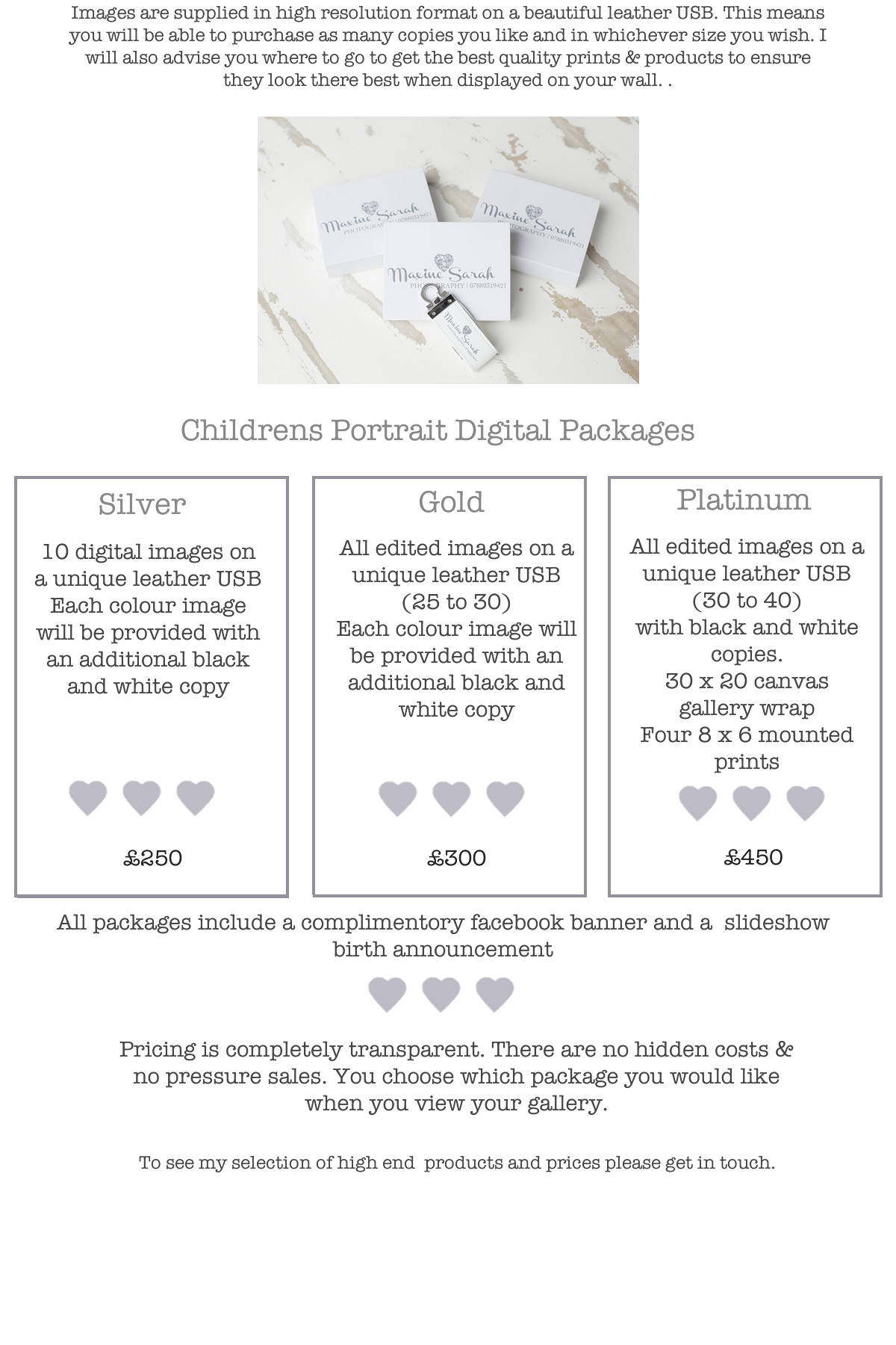 Childrens Portrait Packages. During this session I will ask you to bring a few different out-fit changes. Clothing is very important, outfits that are timeless, plain colours tend to be the better option rather than modern bright patterns and colours. Denim dungarees look great for boy’s with either just a plain white vest or nothing underneath. I also have a wide range of clothes and props that we can use. If you have anything special in mind that you would like or preferred colours of backdrops or styles then please let me know before the date of the session. I use various different backdrops and will include a range of black and white images to choose from. If you would like parent shots those can be done also. I usually ask you to bring snacks and drinks for the little one as I tend to work at baby’s/child’s pace. I only book one session a day so that we do not have to rush anything. Children and babies will definitely let us know when they have had enough. Sessions for this age can last anything from an hour to two hours depending on the child.